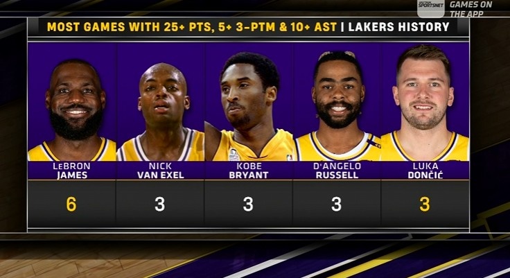 湖人队史单场至少25分10助&命中3记三分场次:詹姆斯6次最高;东契奇,拉塞尔,科比,范埃克塞尔皆3次