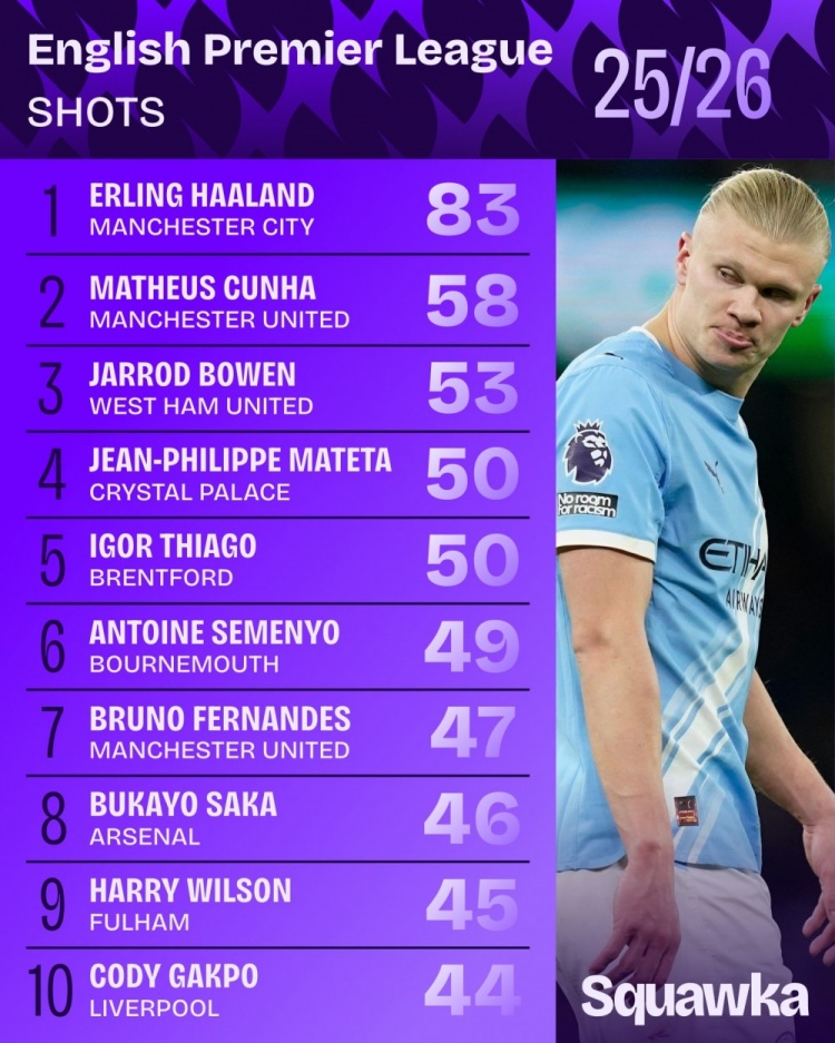 1月10日讯 Squawka统计了本赛季球员在英超的射门次数,并列出榜单,哈兰德83次断层居首。